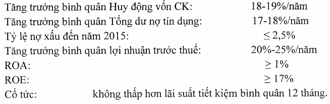 Năm 2012, dự kiến kế hoạch huy động vốn 337.000 tỷ đồng; tổng dư nợ tín dụng 326.400 tỷ đồng; lợi nhuận trước thuế 5.800 tỷ đồng; nợ xấu 2,8%; tỷ lệ chi trả cổ tức 14%.