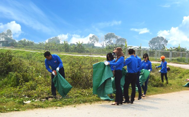 | Đoàn viên thanh niên phát quang cây cỏ, bụi rậm hai bên đường gom và dọn vệ sinh trên taluy đường cao tốc. |