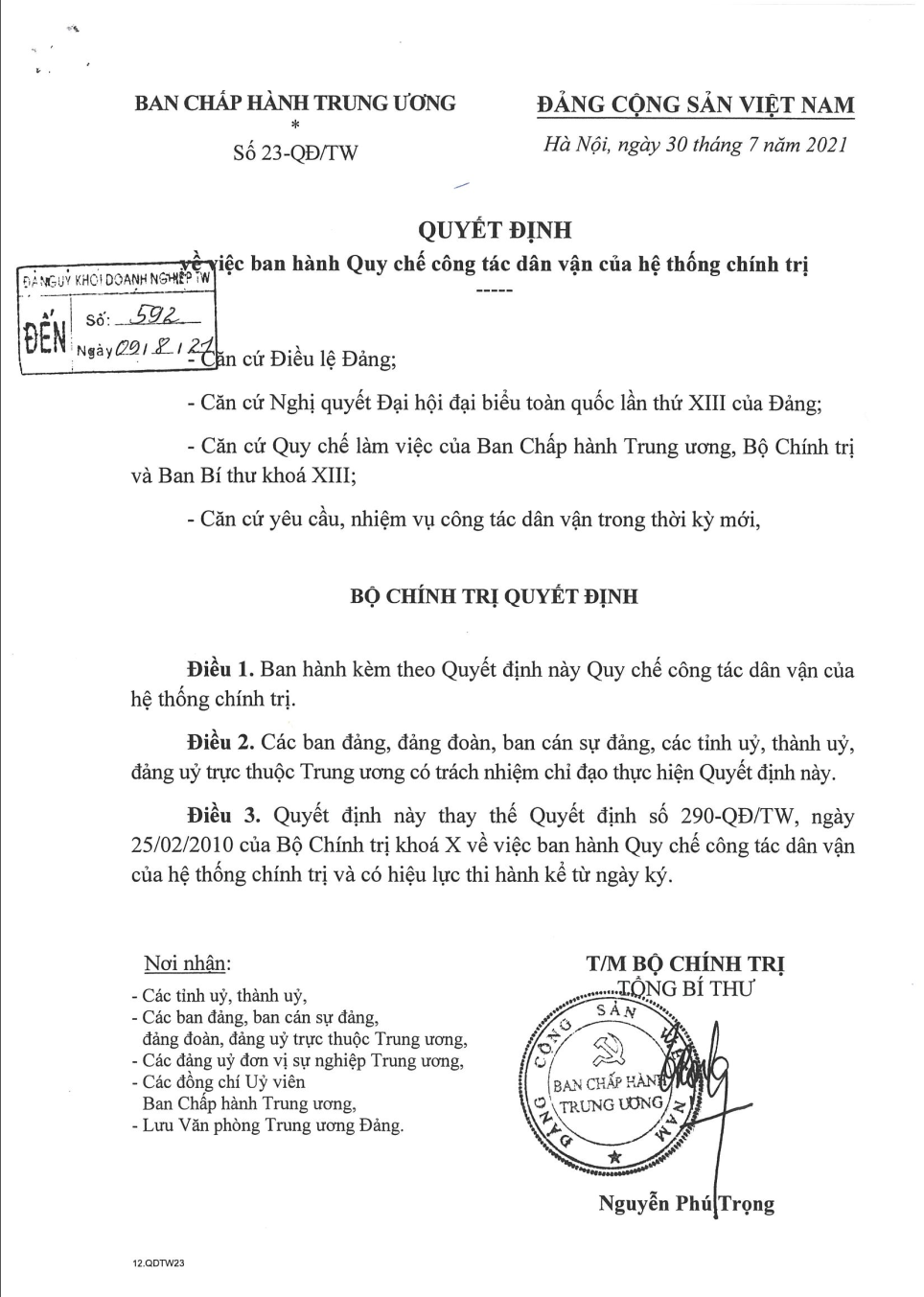Ngày 30/7/2021, Bộ Chính trị ban hành Quyết định số 23-QĐ/TW về việc ban hành Quy chế công tác dân vận của hệ thống chính trị. Tạp chí điện tử Đảng ủy Khối Doanh nghiệp Trung ương đăng nội dung Quyết định và toàn văn Quy chế tại đây: