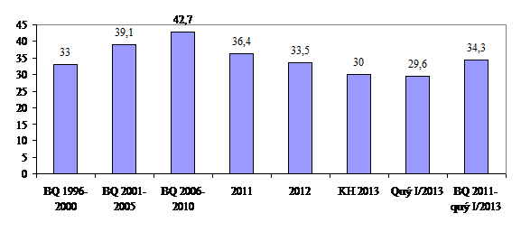 Tỷ lệ vốn đầu tư xã hội/GDP quý I/2013 của nước ta mặc dù vẫn còn cao so với hầu hết các nước trên thế giới, nhưng đã thấp hơn chỉ tiêu kế hoạch cả năm 2013 và việc giảm xuống liên tục mấy năm nay là quá nhanh. Đành rằng, trong điều kiện phải tập trung thực hiện mục tiêu ưu tiên, phải xử lý các điểm nghẽn lớn, việc khởi động tái cơ cấu kinh tế, chuyển đổi mô hình tăng trưởng còn chậm, hiệu quả đầu tư chưa cao, thì việc giảm nhanh quy mô vốn đầu tư như trên không khác gì một sự “thắt chặt” và tác động đến tăng trưởng kinh tế.