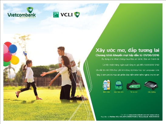 Nhân dịp ra mắt sản phẩm mới Bảo an tài trí, Ngân hàng Vietcombank phối hợp Công ty VCLI triển khai chương trình ưu đãi “Xây ước mơ, Đắp tương lai” từ 01/06/2016. Khách hàng khi tham gia sản phẩm Bảo an tài trí hoặc Bảo an thành tài sẽ có cơ hội nhận hàng ngàn quà tặng hấp dẫn trị giá lên đến 1,5 triệu đồng; đồng thời hưởng ưu đãi lên tới 20% học phí khi đăng ký khóa học tại Trung tâm Anh ngữ Language Link; và được tặng 3 năm phí hợp đồng khi mua sản phẩm bổ trợ Bảo hiểm bệnh hiểm nghèo cho trẻ em.