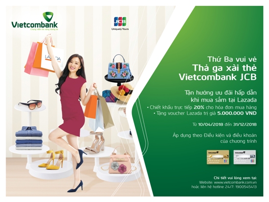 Cụ thể, chiết khấu 20% trên hóa đơn cho giao dịch thanh toán bằng thẻ tín dụng JCB trên website www.lazada.vn và ứng dụng di động của Lazada.