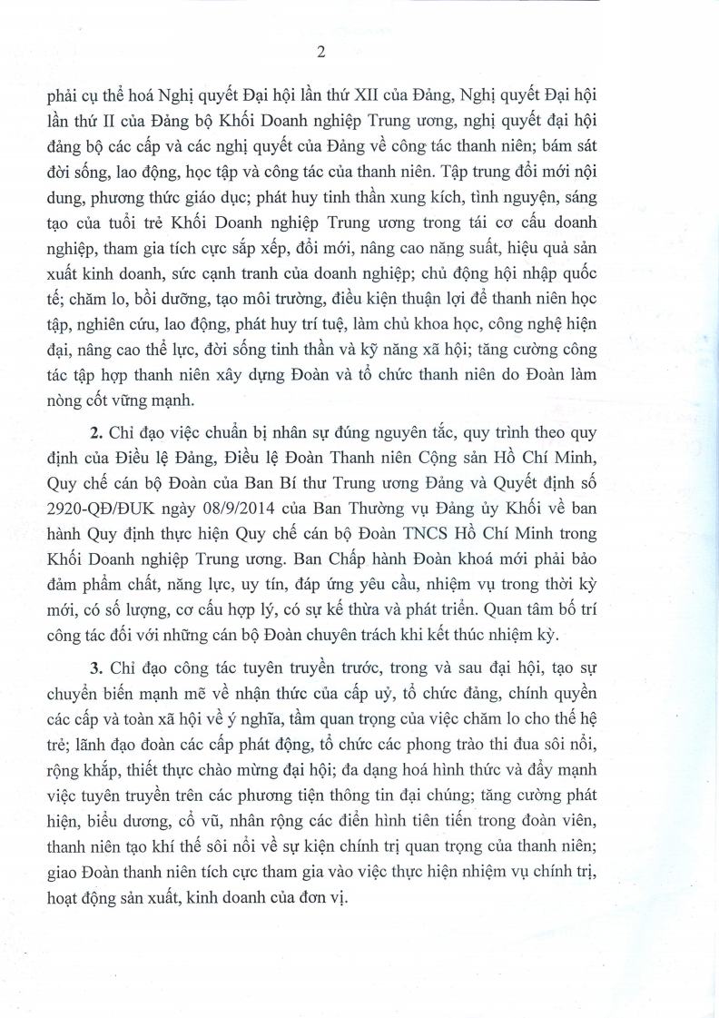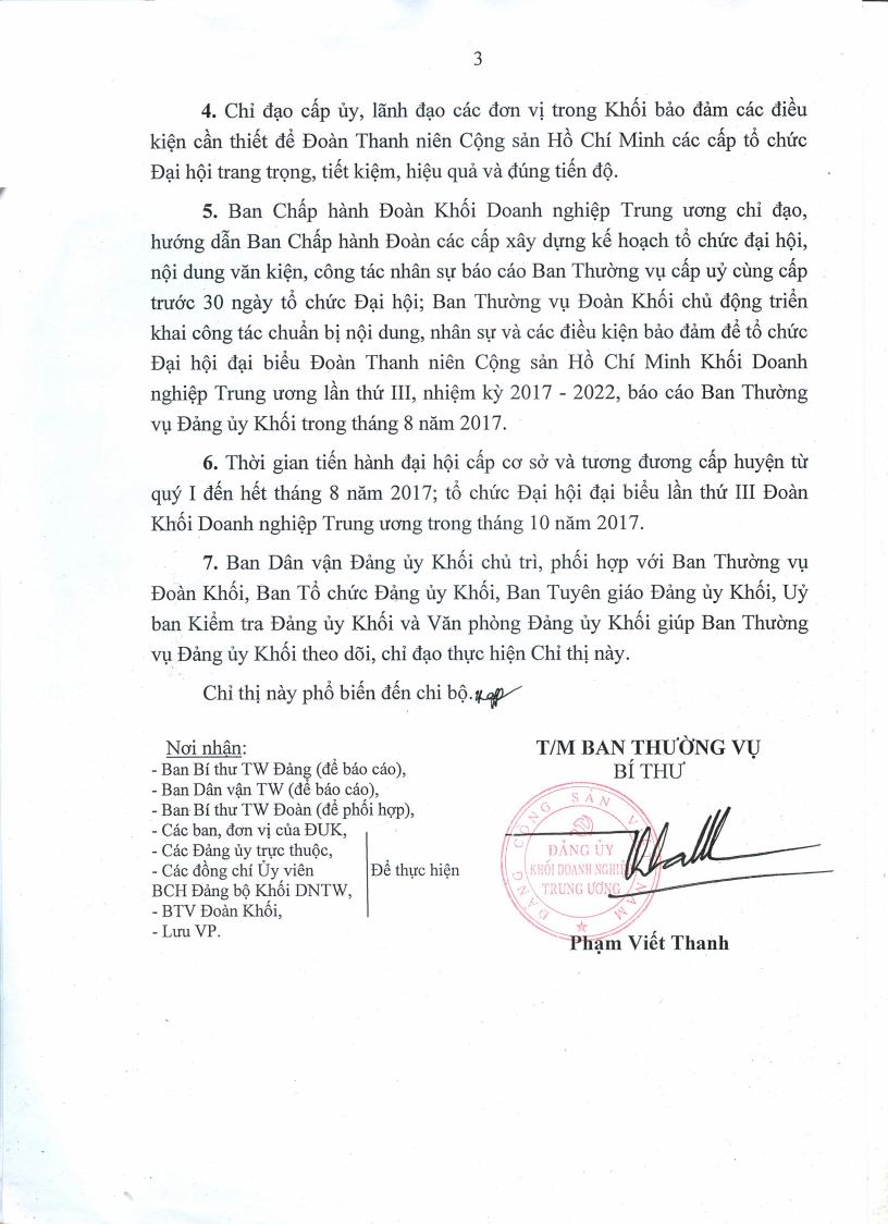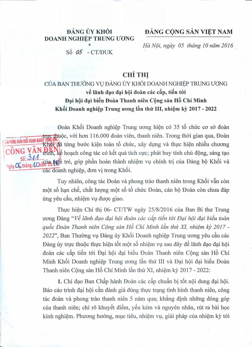 Ngày 05/10/2016, Ban Thường vụ Đảng ủy Khối Doanh nghiệp Trung ương đã ban hành Chỉ thị số 05 - CT/ĐUK về lãnh đạo đại hội đoàn các cấp, tiến tới Đại hội đại biểu Đoàn Thanh niên Cộng sản Hồ Chí Minh Khối DNTW lần thứ III, nhiệm kỳ 2015 - 2020.