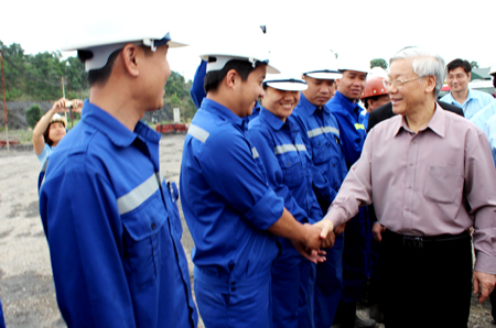 Tổng Bí thư chúc đội ngũ cán bộ, kỹ sư và công nhân của Vinacomin tiếp tục có những thành công mới, phát huy hơn nữa bản chất tiền phong của giai cấp công nhân vùng mỏ tiêu biểu cho giai cấp công nhân Việt Nam, góp phần đưa Quảng Ninh ngày càng đi lên trong sự nghiệp công nghiệp hóa, hiện đại hóa.