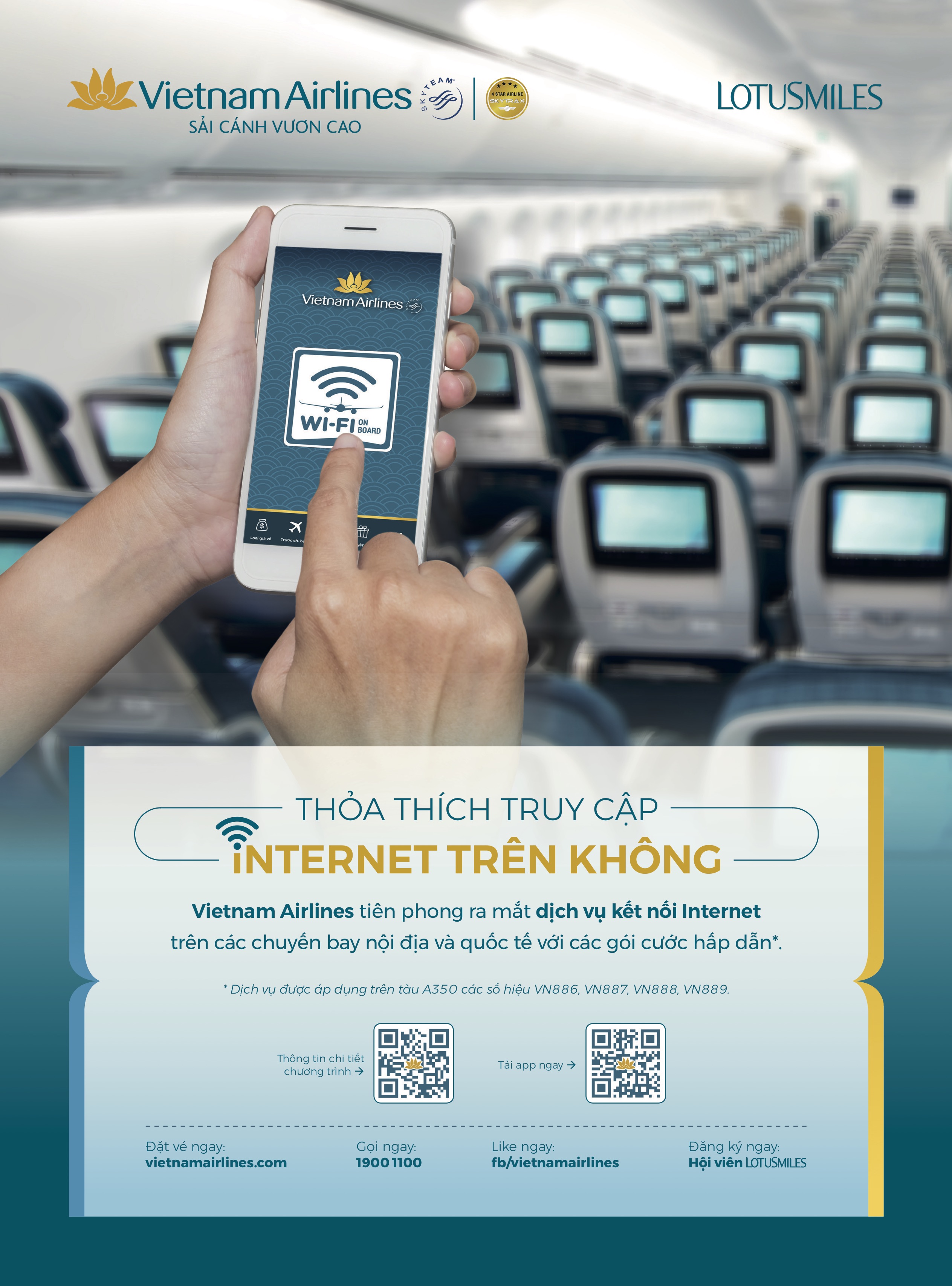 Theo đó, hành khách có thể trải nghiệm dịch vụ WiFi trên một số tàu bay Airbus A350 do Vietnam Airlines khai thác trên các đường bay giữa Hà Nội – TP.HCM/Thượng Hải/Osaka và TP.HCM – Osaka/Singapore. Trong thời gian tới, Hãng sẽ tiếp tục nghiên cứu để nâng cấp, mở rộng dịch vụ trên các tàu bay Boeing 787 và Airbus A350 khác với tốc độ truy cập ngày càng tốt hơn.