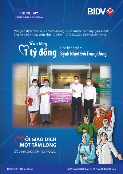 Với mong muốn gắn kết hàng triệu khách hàng chung tay cùng tiền tuyến đấu tranh chống đại dịch Covid-19, từ 04/04/2020 đến 15/04/2020, BIDV phát động chương trình “MỖI GIAO DỊCH - MỘT TẤM LÒNG”.