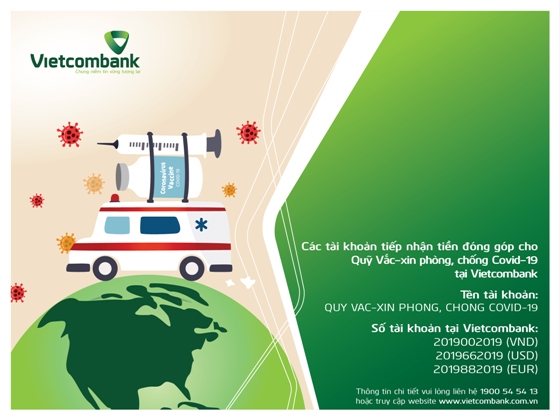 “Quỹ vắc-xin phòng, chống COVID-19” đã có tài khoản tại Vietcombank để tiếp nhận các nguồn tài trợ, hỗ trợ, đóng góp của cá nhân, tổ chức, doanh nghiệp trong và ngoài nước. Số tài khoản: VND: 2019002019; USD: 2019662019; EUR: 2019882019, tại Ngân hàng TMCP Ngoại thương Việt Nam - Chi nhánh Sở Giao Dịch. Vietcombank miễn phí cho tất cả các giao dịch chuyển tiền đến Quỹ vắc-xin phòng, chống COVID-19.