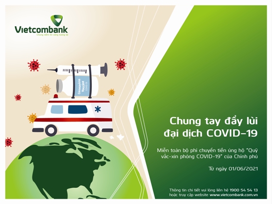 Theo tinh thần chỉ đạo của Thủ tướng Chính phủ, nhằm tạo thuận lợi để các tổ chức và cá nhân đóng góp, hỗ trợ cho Quỹ vắc-xin phòng COVID-19, từ ngày 01/06/2021, Ngân hàng TMCP Ngoại thương Việt Nam (Vietcombank) thực hiện miễn phí cho toàn bộ các giao dịch chuyển tiền của khách hàng cá nhân, khách hàng tổ chức tới các tài khoản tiếp nhận của Quỹ vắc-xin phòng COVID-19 tại Ngân hàng TMCP Đầu tư & Phát triển Việt Nam (BIDV) - Chi nhánh Hà Nội và Sở Giao dịch Kho bạc Nhà nước.