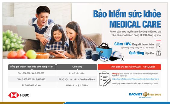 Medical Care là chương trình bảo hiểm sức khỏe của Bảo hiểm Bảo Việt được phân phối độc quyền qua HSBC từ năm 2009 và đã được khách hàng đón nhận một cách rộng rãi trong suốt thời gian qua. HSBC cũng là đối tác phân phối bảo hiểm qua kênh ngân hàng đầu tiên tại Việt Nam cung cấp chương trình bảo hiểm sức khỏe thông qua nền tảng trực tuyến của mình.
