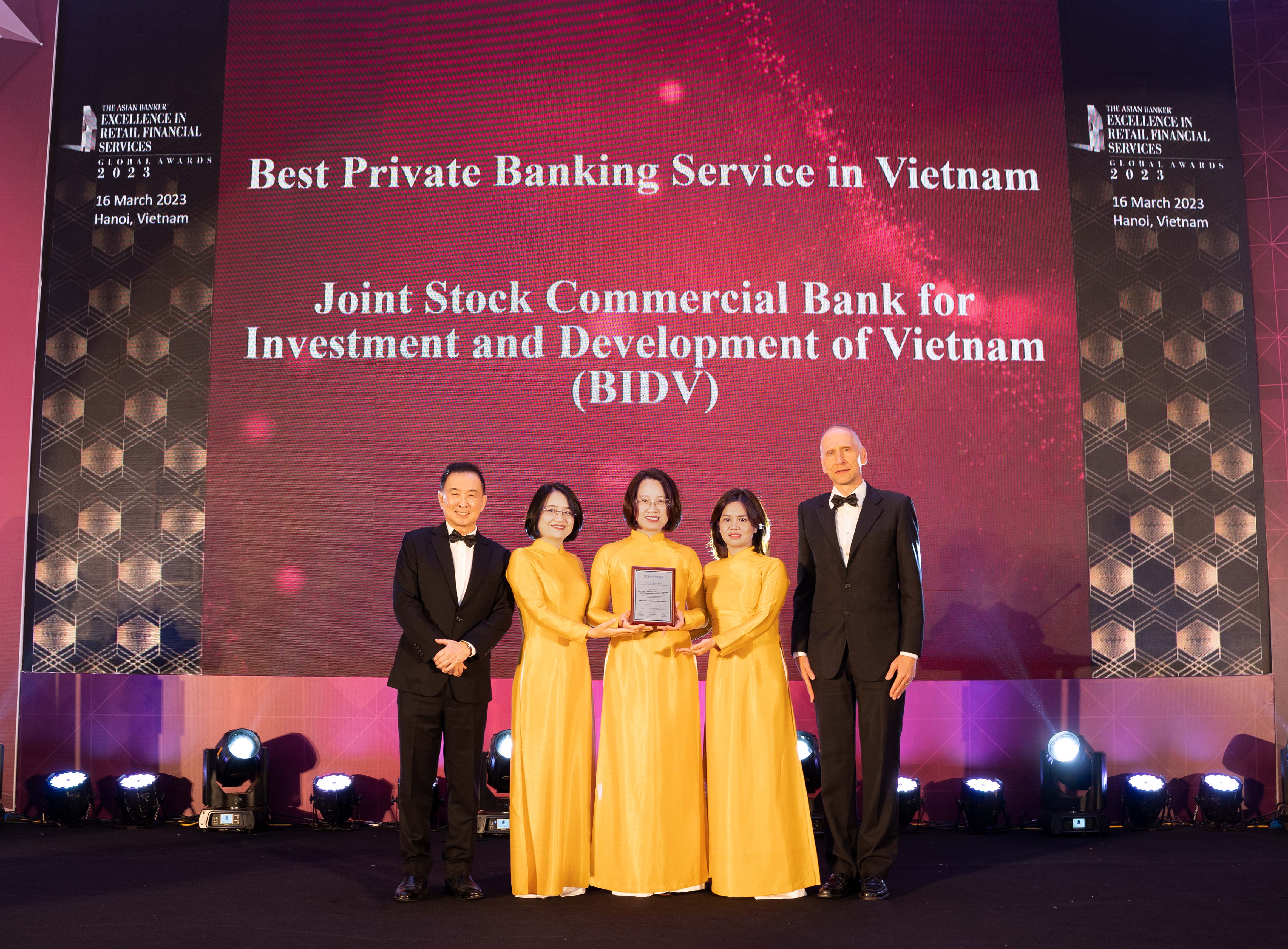 Với những kết quả kinh doanh ấn tượng và dịch vụ vượt trội dành cho khách hàng cá nhân, Ngân hàng TMCP Đầu tư & Phát triển Việt Nam (BIDV) xuất sắc nhận chùm giải thưởng “Ngân hàng bán lẻ tốt nhất Việt Nam” hạng mục State-Owned Retail Bank và “Dịch vụ ngân hàng cao cấp Private Banking tốt nhất Việt Nam” cùng 02 giải thưởng đối với sản phẩm cho vay mua nhà và thẻ tín dụng quốc tế tốt nhất Việt Nam do tạp chí The Asian Banker bình chọn.