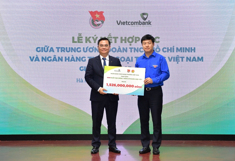 | Tổng giám đốc Vietcombank Nguyễn Thanh Tùng trao tặng 1.000 suất học bổng “Dũng sỹ nghìn việc tốt” cho đại diện Trung ương Đoàn TNCS Hồ Chí Minh. |