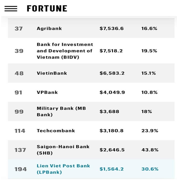 Đứng ở vị trí 37 trong bảng xếp hạng Fortune Southeast Asia 500, Agribank sánh vai cùng nhiều tổ chức tài chính tên tuổi của khu vực như Kasikornbank Bank và Bankgkok Bank của Thái Lan, Mandiri và Bank Central Asia của Indonesia.