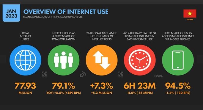 | Sự phát triển của Internet và mạng xã hội tại Việt Nam năm 2023 (Nguồn ảnh: We Are Social). |