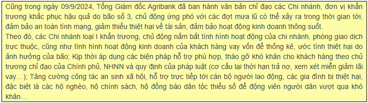 Với đặc thù hoạt động mạng lưới gắn với địa bàn nông nghiệp, nông thôn vốn chịu nhiều rủi ro, tác động của thiên tai, ảnh hưởng trực tiếp tới đời sống, sản xuất kinh doanh của người dân, doanh nghiệp và hoạt động của Agribank, Tổng Giám đốc Agribank chỉ đạo các chi nhánh trên địa bàn chủ động liên hệ khách hàng vay vốn, nắm bắt thiệt hại để kịp thời có các giải pháp hỗ trợ phù hợp; Công ty Bảo hiểm ABIC kịp thời nắm bắt thông tin và thực hiện các thủ tục bồi thường thiệt hại cho khách hàng; các chi nhánh chủ động phối hợp với chính quyền địa phương triển khai công tác an sinh xã hội đối với các gia đình bị thiệt hại về người và tài sản, những khu vực bị ảnh hưởng nặng nề bởi cơn bão…