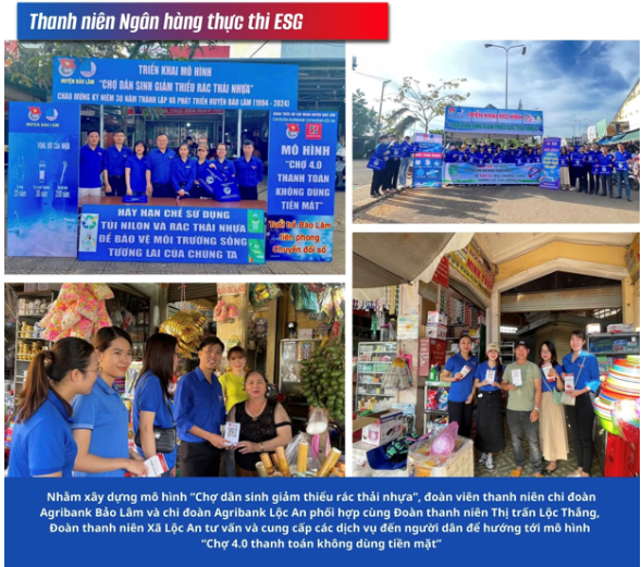 Đoàn Thanh niên Agribank sẵn sàng, chủ động và nắm bắt kịp thời chỉ đạo của Đảng ủy, HĐTV, Ban điều hành về phát triển bền vững gắn với lộ trình triển khai tiêu chuẩn ESG, hoạt động bảo vệ môi trường, ứng phó biến đổi khí hậu, toàn Đoàn Agribank tổ chức nhiều hoạt động tuyên truyền, ra quân bảo vệ môi trường, thu hút đông đảo đoàn viên thanh niên tham gia với nhiều phong trào, hình thức phong phú như: “Ngày thứ bảy tình nguyện”, “Ngày Chủ nhật xanh", “Nói không với rác thải nhựa” nhằm nâng cao nhận thức, thay đổi hành vi của cán bộ, đoàn viên thanh niên chung tay bảo vệ môi trường, ứng phó với biến đổi khí hậu. Chiến dịch làm sạch biển hướng tới mục tiêu giảm thiểu tác động tiêu cực của ô nhiễm rác thải, bảo vệ môi trường biển được các cơ sở đoàn thường xuyên hưởng ứng, tổ chức. Đoàn Agribank luôn tích cực hưởng ứng, tham gia chiến dịch Giờ Trái đất do Đoàn Khối DNTW phát động. Hoạt động hưởng ứng chiến dịch Giờ Trái đất là một trong những việc làm thể hiện vai trò của tuổi trẻ Agribank đối với vấn đề tiết kiệm điện, tiết kiệm năng lượng.