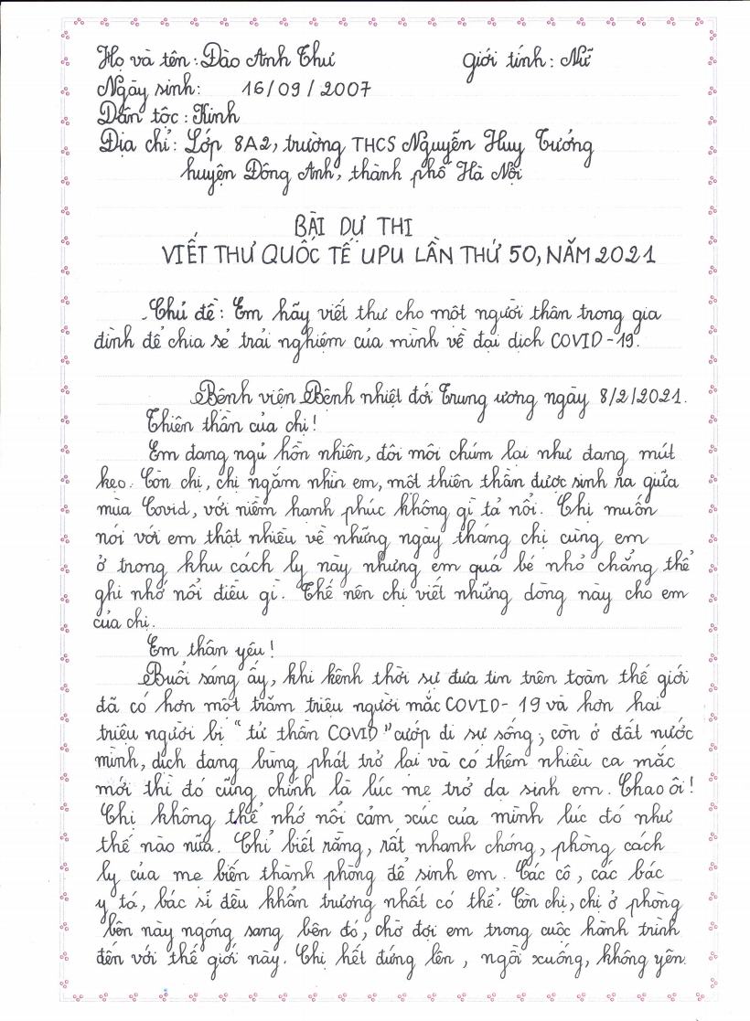 | Em Đào Anh Thư, lớp 8A2, Trường THCS Nguyễn Huy Tưởng, huyện Đông Anh, TP. Hà Nội đã đoạt giải Nhất Quốc gia cuộc thi Viết thư quốc tế UPU lần thứ 50 (2021) tại Việt Nam. |
