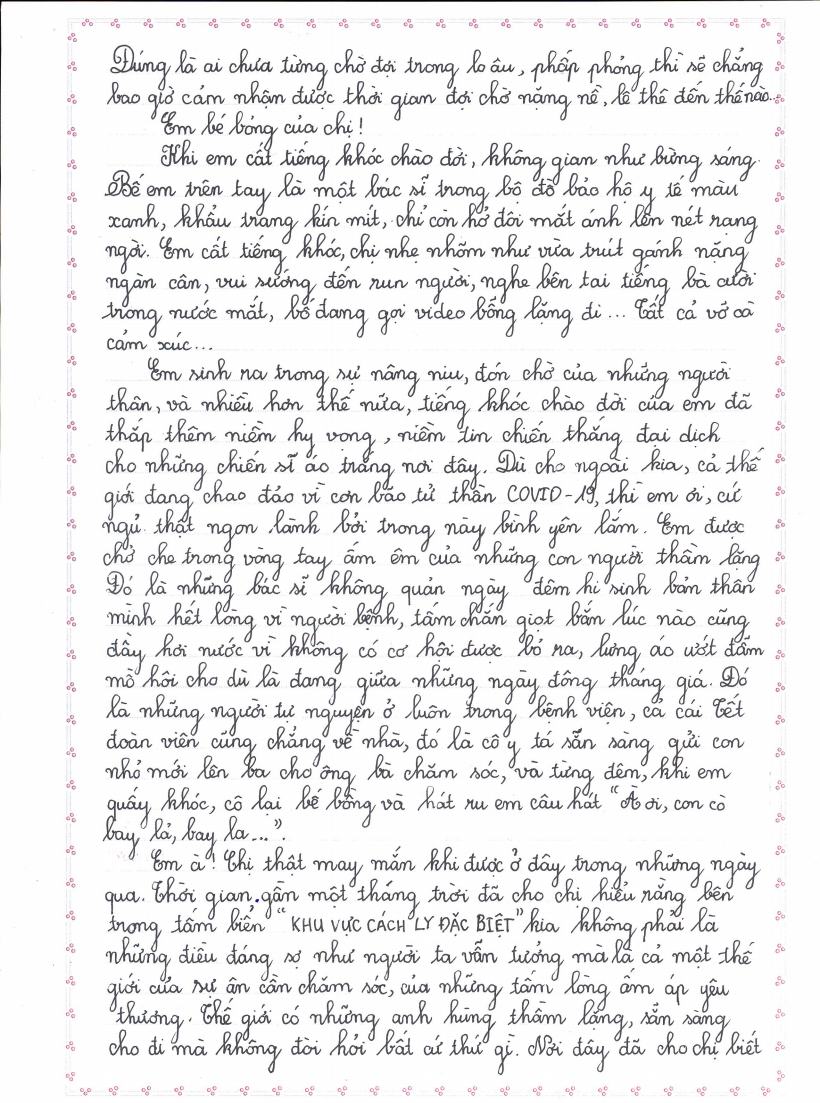 Chủ nhân của bức thư đoạt giải Nhất lựa chọn ý tưởng gửi thư cho em bé gái được sinh ra khi mẹ đang điều trị COVID tại Bệnh viện Nhiệt đới Trung ương để nói lên những khó khăn, vất vả của các y bác sĩ và tự hào về sự đóng góp của họ trong công tác phòng chống dịch ở Việt Nam. Bức thư là lời thủ thỉ kể chuyện của chị với cô em gái bé bỏng vừa được sinh ra trong đại dịch rất chân thực, xúc động mang thông điệp rõ ràng, cách trình bày lôgic, hợp lý. Bức thư của em Đào Anh Thư đã được Ban Tổ chức dịch ra tiếng Pháp gửi Liên minh Bưu chính Thế giới (UPU) tại Thụy Sĩ dự thi Quốc tế.