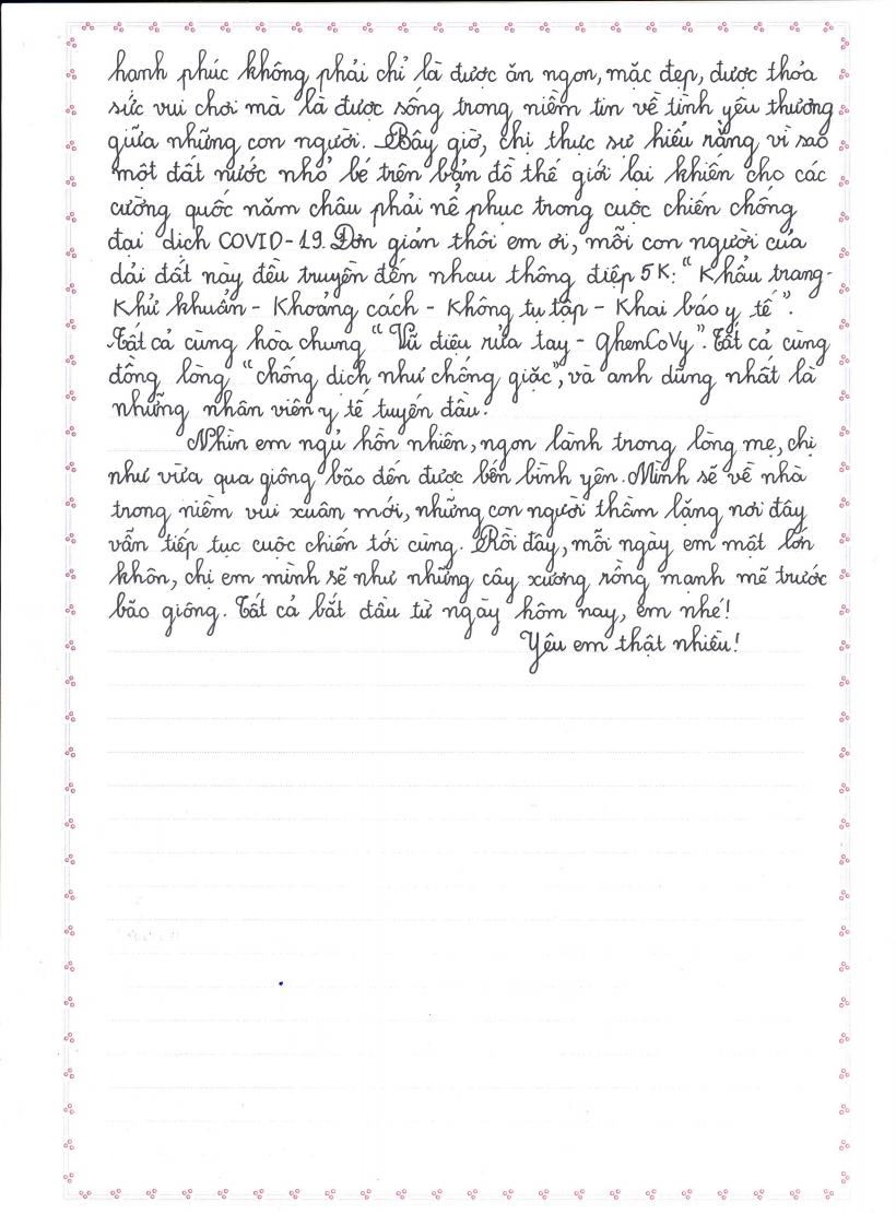 Đa số các bức thư đều kể lại trải nghiệm của các em khi phải nghỉ học ở nhà, không được đến trường, lạ lẫm với cách học online nhưng lại được đoàn tụ gia đình, gần gũi, chia sẻ tình cảm với ông bà, cha mẹ, anh chị em...