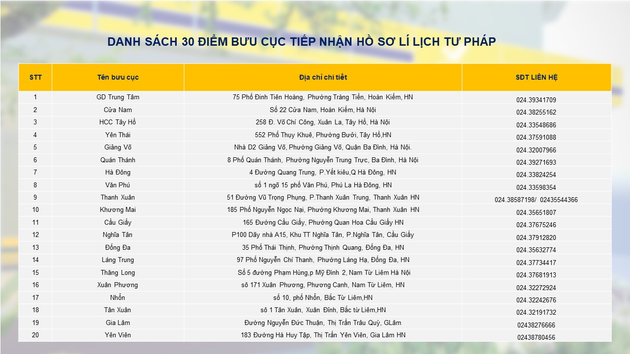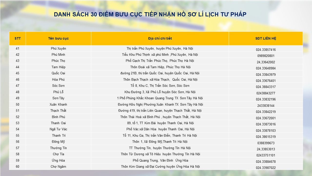 Danh sách 60 bưu cục của Bưu điện TP. Hà Nội thực hiện tiếp nhận hồ sơ lý lịch tư pháp: