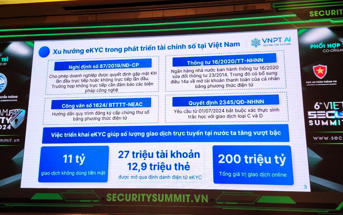 Trong nội dung chia sẻ, Giám đốc nền tảng định danh và xác thực điện tử VNPT eKYC Nguyễn Quang Huy dẫn chứng, Nghị định số 87/2019/NĐ-CP cho phép doanh nghiệp được quyết định gặp mặt khách hàng lần đầu trực tiếp hoặc không trực tiếp lần đầu, trường hợp không trực tiếp cần đảm bảo các biện pháp công nghệ. Cùng với đó, Công văn số 1624/BTTTT-NEAC cũng đã hướng dẫn quy trình đăng ký cấp chứng thư số bằng phương thức điện tử. Mới đây, Quyết định 2345/QĐ-NHNN được ban hành yêu cầu từ 01/07/2024 bắt buộc xác thực sinh trắc học với giao dịch loại C và D. Những quy định, yêu cầu này sẽ góp phần thúc đẩy hơn nữa xu thế triển khai eKYC trong phát triển tài chính số tại Việt Nam. Đại diện đến từ VNPT cũng đưa ra những con số dẫn chứng cụ thể. Việc triển khai eKYC giúp số lượng giao dịch trực tuyến tại nước ta tăng vượt bậc trong thời gian qua với 11 tỷ giao dịch không dùng tiền mặt; 27 triệu tài khoản 12,9 triệu thẻ được mở qua định danh điện tử eKYC; 200 triệu tỷ tổng giá trị giao dịch online. Bên cạnh đó, cũng phải thẳng thắn nhìn vào thực trạng vấn đề giả mạo trong giao dịch tài chính, với 15.900 ghi nhận trường hợp lừa đảo trên mạng Internet trong 11 tháng đầu 2023, trong đó có 91% liên quan đến giả mạo, lừa đảo trong tài chính ngân hàng; 391,8 nghìn tỷ đồng lừa đảo chiếm đoạt, tương đương 3,6% GDP cả nước vào năm 2023.