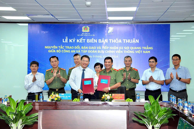 Vừa qua, tại Hà Nội, Tập đoàn Bưu chính Viễn thông Việt Nam (VNPT) cùng Bộ Công an đã ký thỏa thuận nguyên tắc trao đổi, bàn giao và tiếp nhận 02 sợi quang trắng - thiết bị phục vụ cho công tác của Cục Viễn thông và Cơ yếu - Bộ Công an.