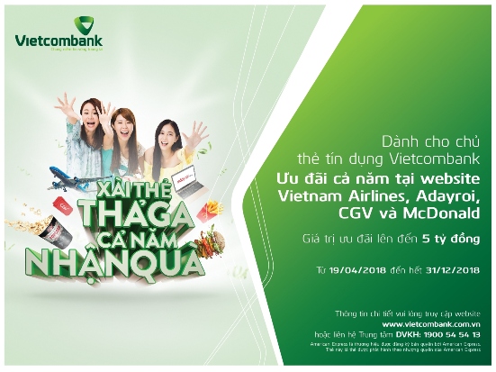 Trong thời gian từ 19/04/2018 đến 31/12/2018, Ngân hàng TMCP Ngoại thương Việt Nam (Vietcombank) triển khai chương trình “Xài thẻ thả ga, cả năm nhận quà” với nhiều ưu đãi hấp dẫn dành cho toàn bộ chủ thẻ tín dụng các thương hiệu do Vietcombank phát hành.