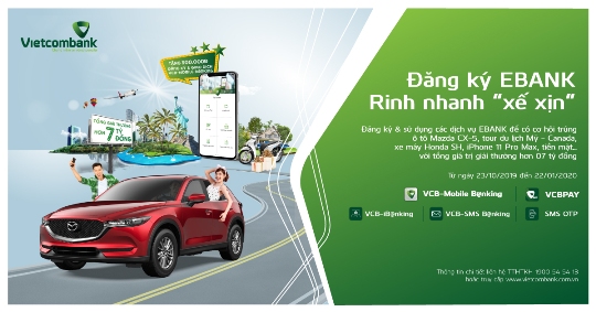Với mong muốn mang đến cho khách hàng trải nghiệm các tiện ích giao dịch thanh toán không tiền mặt, Vietcombank triển khai chương trình khuyến mại “Đăng ký Ebank, Rinh nhanh xế xịn” với cơ hội trúng các giải thưởng lên tới hơn 7 tỷ đồng.