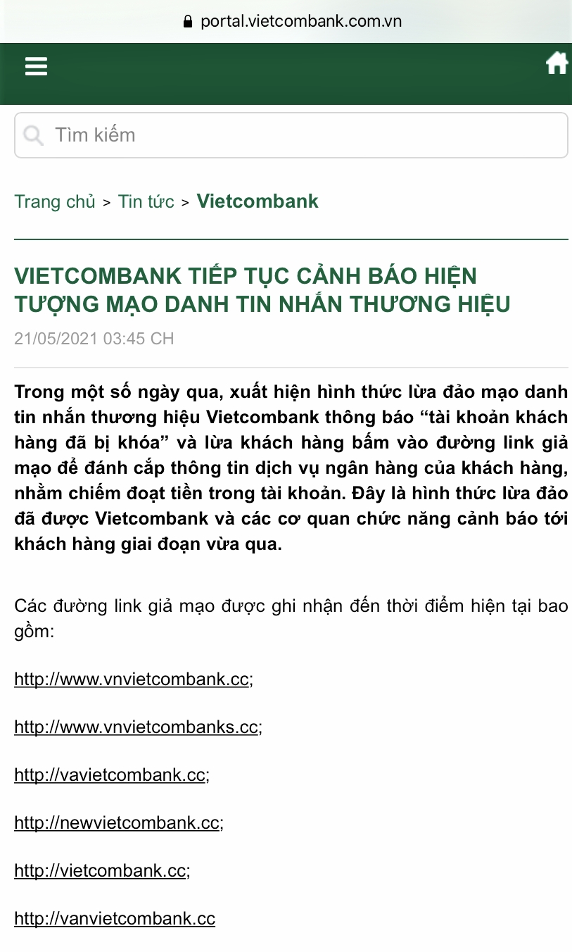 Vietcombank cảnh báo về hình hình thức lừa đảo mạo danh ngân hàng