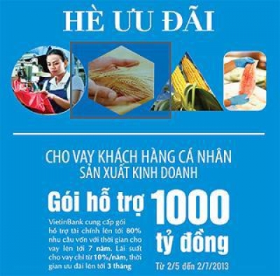 Từ nay đến hết ngày 2/7, Ngân hàng TMCP Công thương Việt Nam (VietinBank) triển khai trên toàn quốc gói tín dụng “Hè ưu đãi” trị giá 1.000 tỷ đồng dành cho khách hàng cá nhân và hộ gia đình có nhu cầu vay vốn phục vụ xuất kinh doanh như: cho vay phục vụ thương nghiệp, công nghiệp, dịch vụ, nông nghiệp, nông thôn...