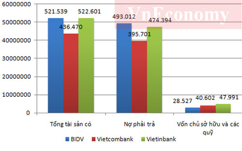 Các chỉ tiêu tài chính của ba ngân hàng đến 30/6/2013 (đơn vị: tỷ đồng) - Nguồn: Báo cáo tài chính hợp nhất của BIDV, Vietcombank, Vietinbank.