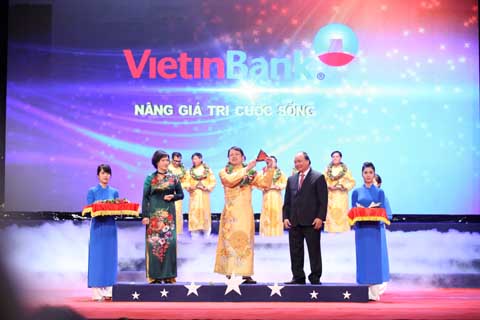 Phó Thủ tướng Chính phủ Nguyễn Xuân Phúc và Phó Chủ tịch Quốc hội Nguyễn Thị Kim Ngân trao giải cho TOP 10 Sao Vàng đất Việt 2013 - Ảnh: Minh Châu |