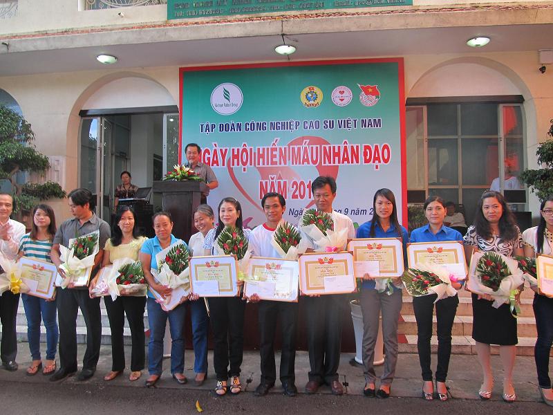 Để ghi nhận nghĩa cử cao đẹp của CNVC LĐ, Tập đoàn Công nghiệp Cao su Việt Nam đã tuyên dương, khen thưởng 19 cá nhân tiêu biểu (có từ 3 – 10 lần tham gia hiến máu nhân đạo) trong phong trào vận động, tham gia hiến máu nhân đạo.