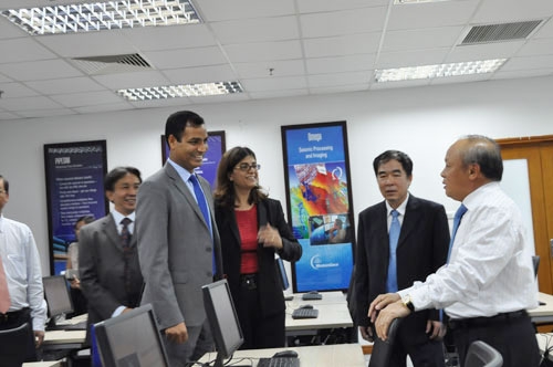 Tại Trung tâm mô hình hóa mỏ PVU, Tổng giám đốc Petrovietnam Đỗ Văn Hậu trao đổi với các nhà khoa học của Công ty Schlumberger về khả năng phát triển hợp tác KH&CN