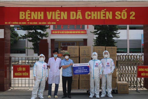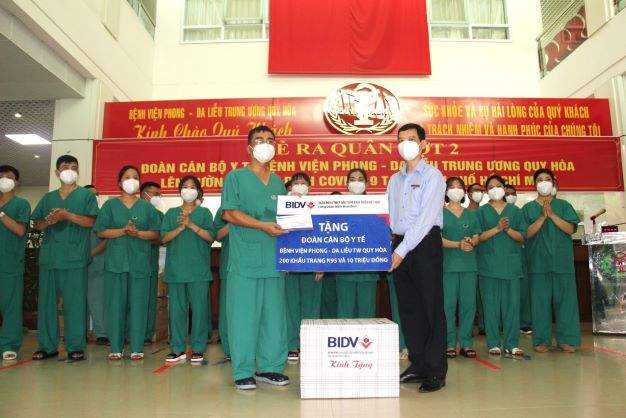 | Cán bộ BIDV không ngại nguy hiểm để trao tận tay những bộ đồ phòng chống Covid-19, trang thiết bị y tế... gửi tặng đến các y bác sỹ, những chiến sĩ đang làm nhiệm vụ vùng tâm dịch tại 19 tỉnh, thành phía Nam, tiếp thêm sức mạnh tinh thần cho các chiến sỹ áo trắng trong cuộc chiến chống lại đại dịch, bảo vệ sức khỏe nhân dân. |