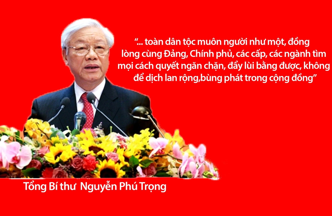 Thay mặt lãnh đạo Đảng, Nhà nước, Tổng Bí thư Nguyễn Phú Trọng đã 2 lần ra lời kêu gọi đồng bào, đồng chí, chiến sĩ cả nước và đồng bào ta ở nước ngoài về công tác về công tác phòng chống đại dịch Covid - 19 . Cả hệ thống chính trị vào cuộc quyết liệt chính là yếu tố cơ bản nhất để chiến thắng dịch bệnh., trong đó chỉ rõ: “Chúng ta đã cố gắng càng cố gắng hơn nữa; đã đoàn kết càng đoàn kết hơn nữa; đã quyết tâm càng quyết tâm cao hơn nữa; toàn dân tộc muôn người như một, đồng lòng cùng Đảng, Chính phủ, các cấp, các ngành tìm mọi cách quyết ngăn chặn, đẩy lùi bằng được, không để dịch lan rộng, bùng phát trong cộng đồng...” . Lời kêu gọi của Tổng Bí thư không chỉ thể hiện sự kế thừa mà còn là lời hiệu triệu khi Tổ quốc lâm nguy, mà còn là cơ sở động lực, niềm tin và nhân lên lòng yêu nước của dân tộc Việt Nam. Lời kêu gọi thể hiện trọng trách lớn lao, trọng trách và người đứng đầu Đảng đối với vận mệnh dân tộc và thể hiện sự quyết tâm của Đảng và Nhà nước ta trước đại dịch.