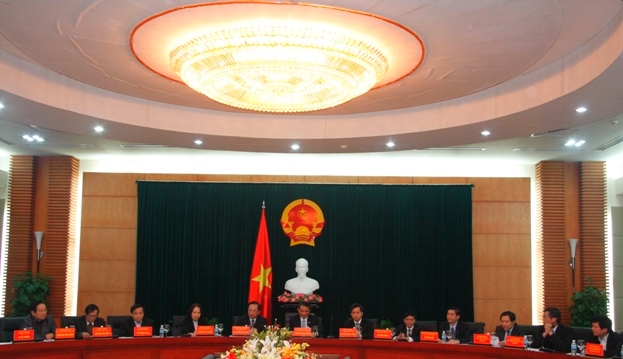 | Đồng chí Trương Quang Nghĩa, Uỷ viên T.Ư Đảng, Bí thư Đảng ủy Khối doanh nghiệp T.Ư nghe các báo cáo của Lãnh đạo Tập đoàn Hóa chất Việt Nam và Công ty DAP-VINACHEM |