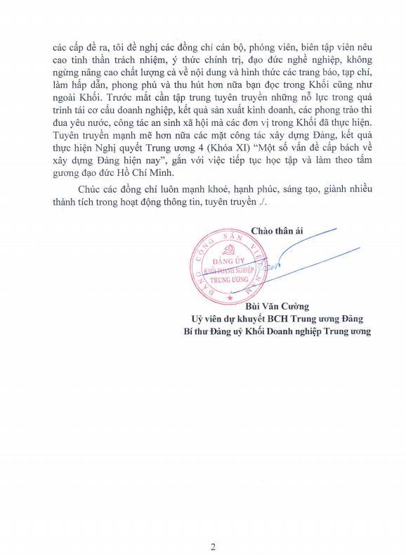 Đồng chí Bí thư Đảng ủy Khối Doanh nghiệp Trung ương gửi thư chúc mừng tới các cơ quan báo chí