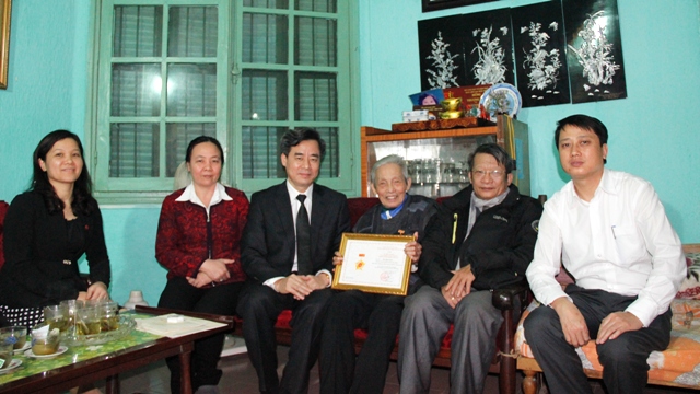 | Đồng chí Nguyễn Quang Dương, Phó Bí thư Đảng ủy Khối trao quà mừng thọ cán bộ hưu trí cao tuổi. |
