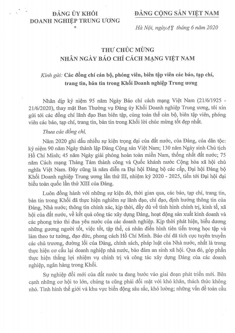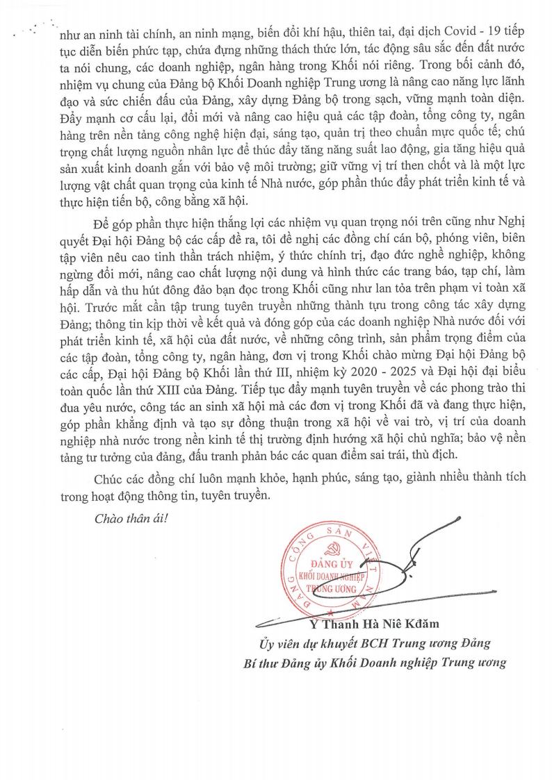 Nhân dịp kỷ niệm 95 năm Ngày Báo chí cách mạng Việt Nam (21/6/1925 - 21/6/2020), đồng chí Y Thanh Hà Niê Kđăm - Ủy viên dự khuyết Trung ương Đảng, Bí thư Đảng ủy Khối Doanh nghiệp Trung ương đã gửi Thư chúc mừng đến toàn thể cán bộ, biên tập viên, phóng viên các báo, tạp chí, trang tin, bản tin trong Khối.