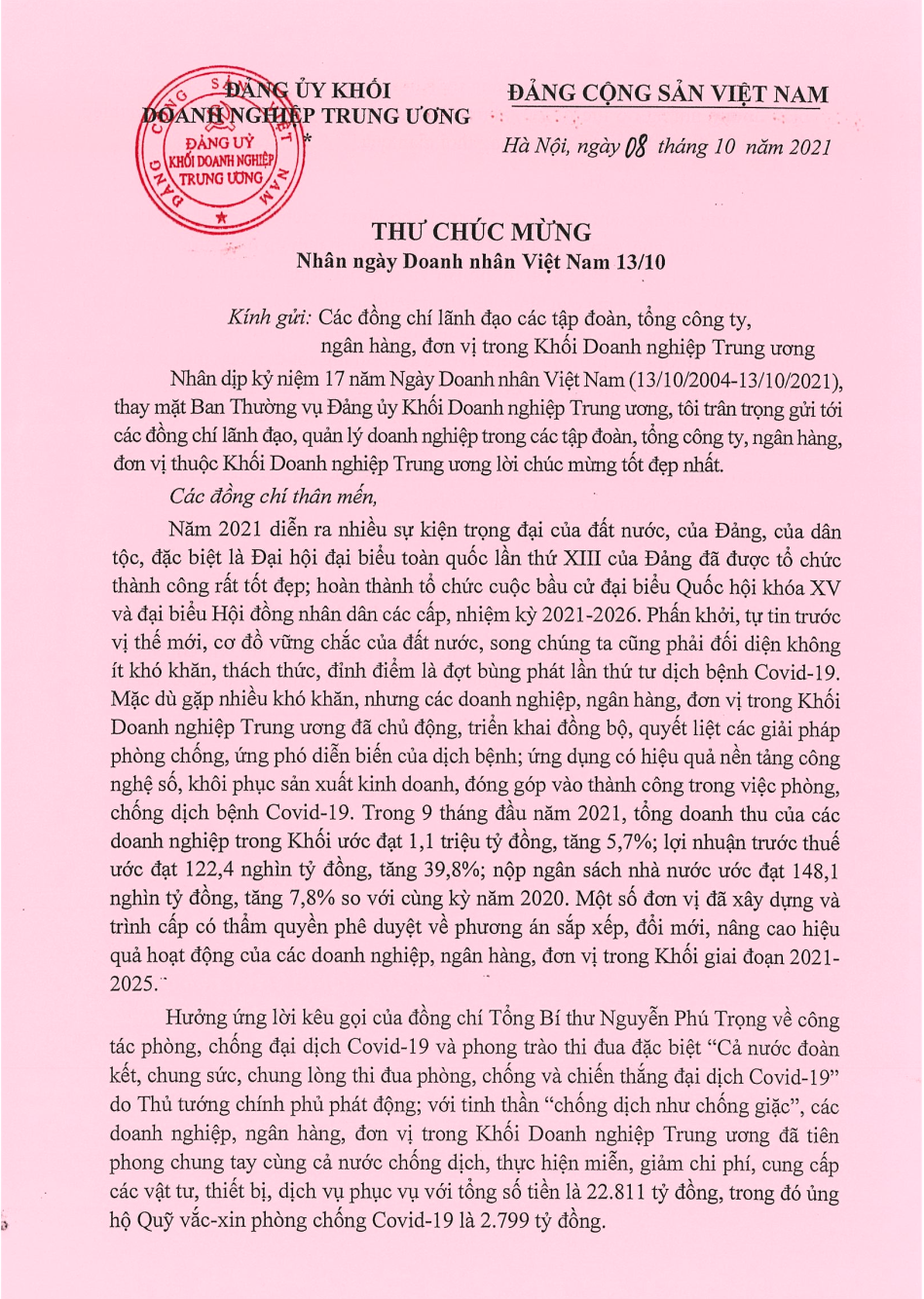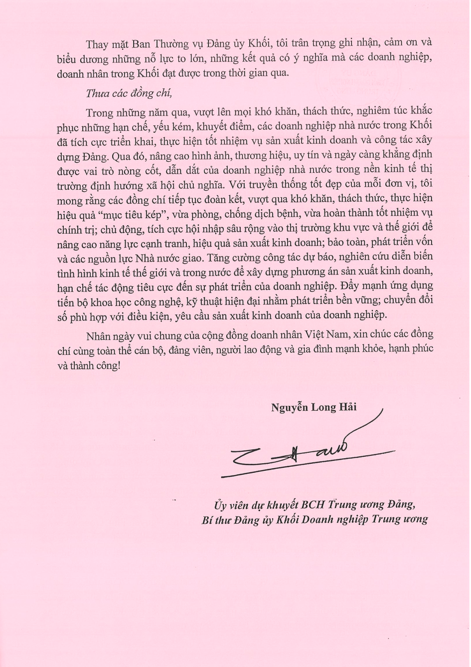 Nhân dịp kỷ niệm 17 năm Ngày Doanh nhân Việt Nam (13/10/2004 - 13/10/2021), đồng chí Nguyễn Long Hải - Ủy viên dự khuyết BCH Trung ương Đảng, Bí thư Đảng ủy Khối Doanh nghiệp Trung ương đã gửi Thư chúc mừng đến các đồng chí lãnh đạo, quản lý doanh nghiệp trong các tập đoàn, tổng công ty, ngân hàng, đơn vị trong Khối.