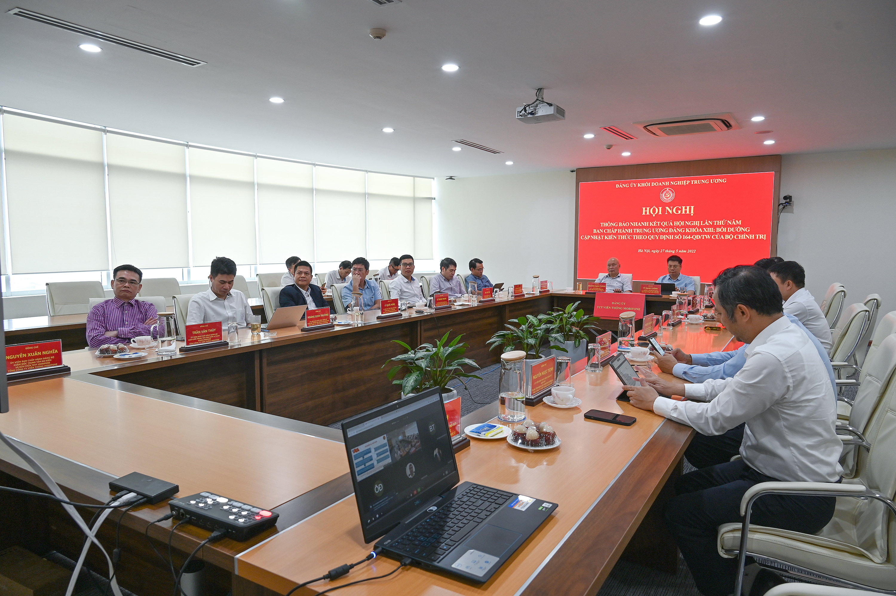 Ngày 27/5, Đảng ủy Khối Doanh nghiệp Trung ương tổ chức Hội nghị thông báo nhanh kết quả Hội nghị Trung ương 5 khóa XIII; bồi dưỡng, cập nhật kiến thức theo Quy định số 164-QĐ/TW, ngày 01/02/2013 của Bộ Chính trị cho đối tượng 3 là các đồng chí cán bộ thuộc diện Ban Thường vụ Đảng ủy Khối quản lý bằng hình thức trực tiếp và kết nối trực tuyến tới các đảng ủy trực thuộc Đảng ủy Khối.