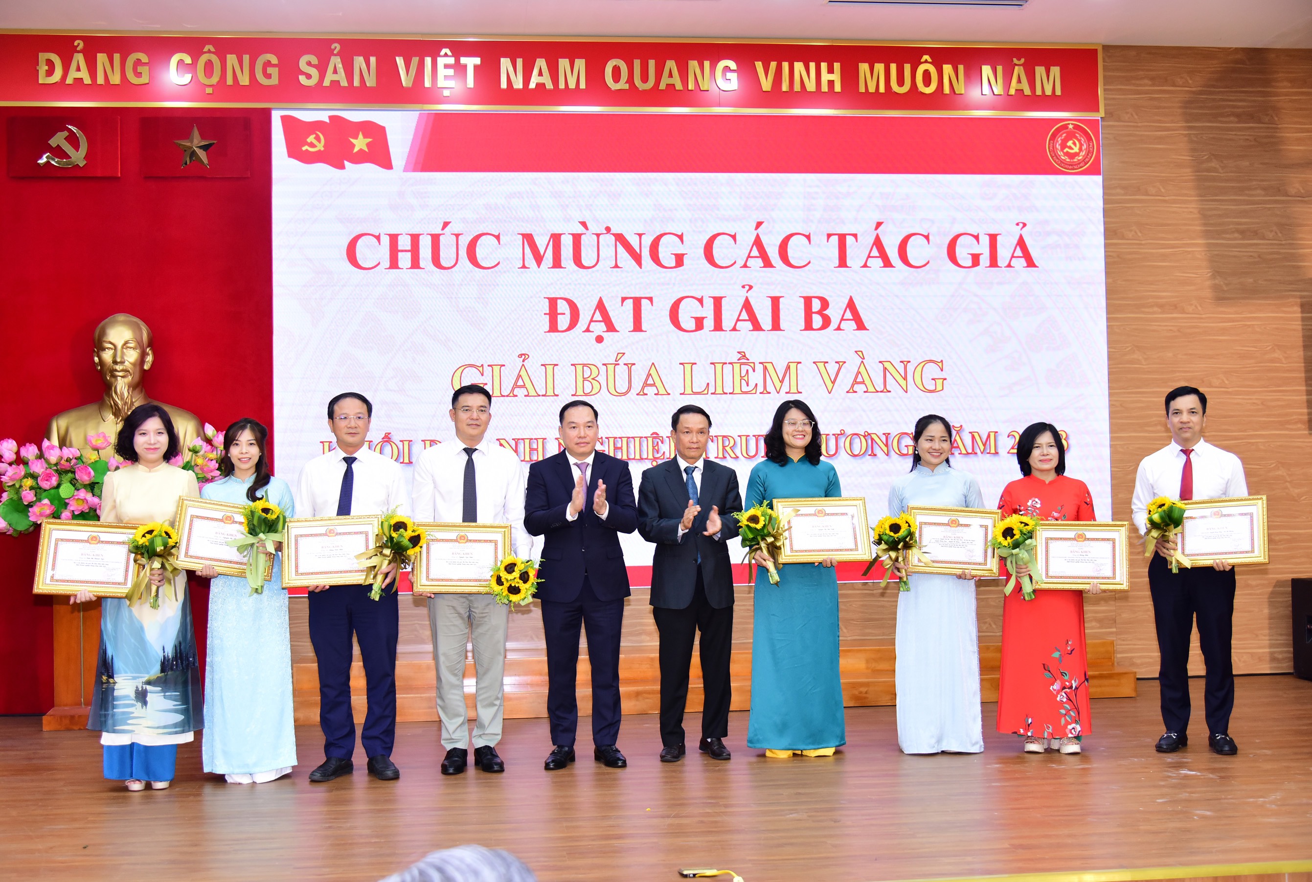 | Đồng chí Chu Đình động, Ủy viên Ban Thường vụ, Trưởng Ban Tổ chức Đảng ủy Khối và đồng chí Phạm Thanh Cẩm, Quyền Vụ trưởng Vụ Tổ chức - Cán bộ, Ban Tuyên giáo Trung ương, trao Bằng khen của Đảng ủy Khối và tặng hoa cho các tác giả đạt giải Khuyến Khích, Giải Búa liềm vàng Khối DNTW năm 2023. |