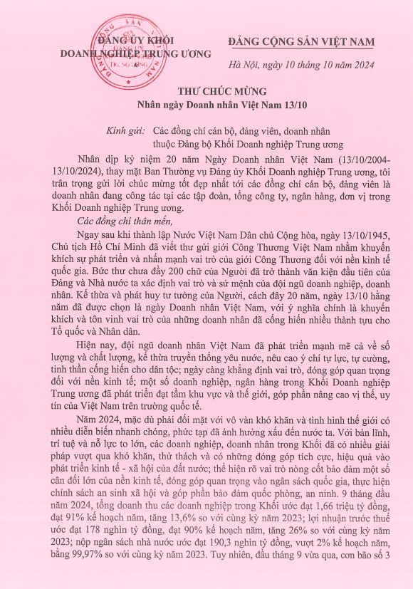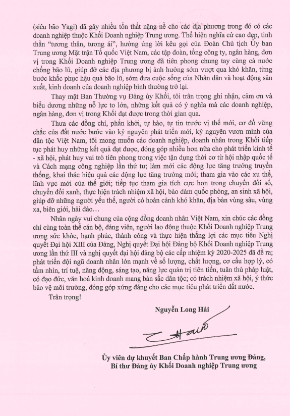 Thư chúc mừng của Bí thư Đảng uỷ Khối Doanh nghiệp Trung ương nhân Ngày Doanh nhân Việt Nam (13/10)
