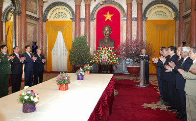 Dự buổi chúc Tết có nguyên Tổng Bí thư Nông Đức Mạnh, Chủ tịch nước Trương Tấn Sang, nguyên Chủ tịch nước Trần Đức Lương, Thủ tướng Chính phủ Nguyễn Tấn Dũng, Chủ tịch Quốc hội Nguyễn Sinh Hùng, nguyên Chủ tịch Quốc hội Nguyễn Văn An, Chủ tịch Ủy ban Trung ương Mặt trận Tổ quốc Việt Nam Huỳnh Đảm, các đồng chí Uỷ viên Bộ Chính trị, Bí thư Trung ương Đảng, các đồng chí nguyên Uỷ viên Bộ Chính trị, nguyên Bí thư trung ương Đảng, các đồng chí Bộ trưởng…