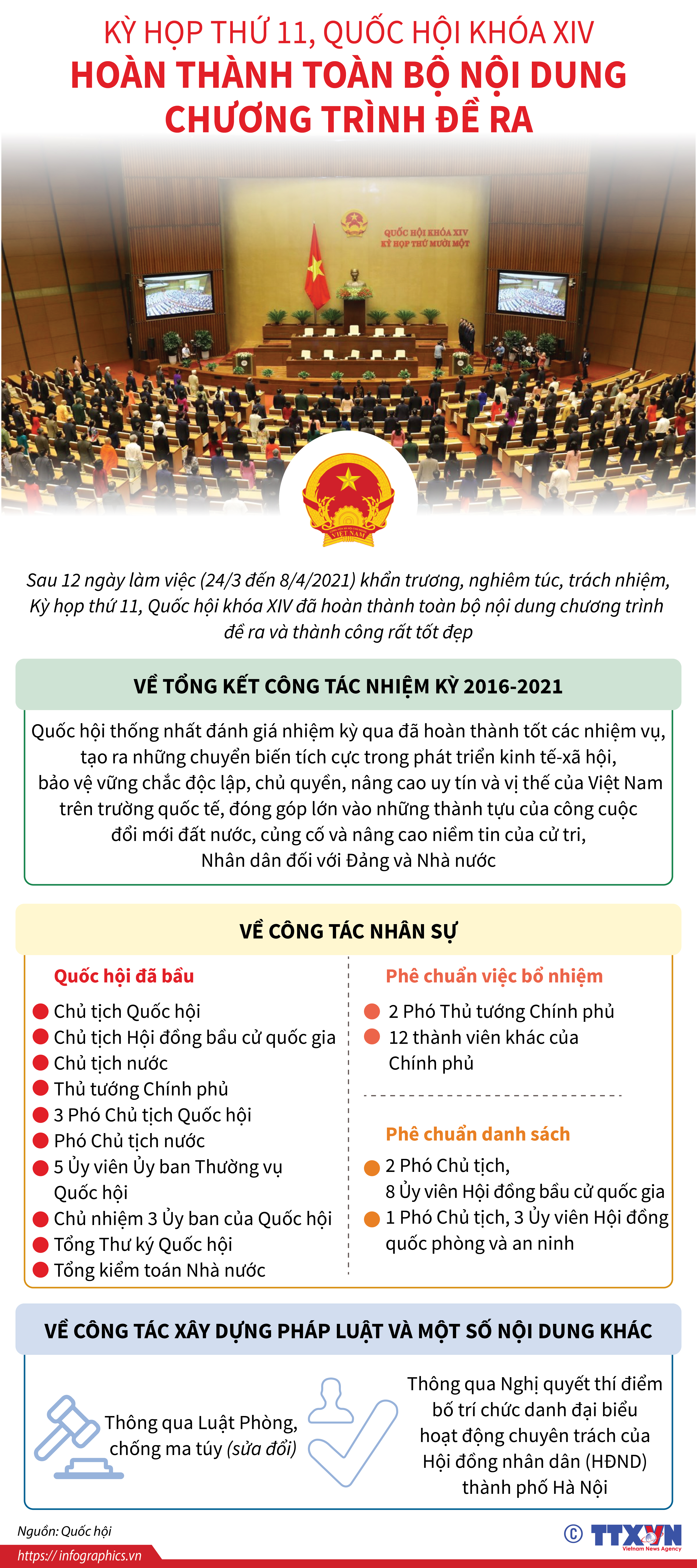 Sau 12 ngày làm việc (24/3 đến 8/4/2021) khẩn trương, nghiêm túc, trách nhiệm, Kỳ họp thứ 11, Quốc hội khóa XIV đã thành công rất tốt đẹp, hoàn thành toàn bộ nội dung chương trình đề ra.