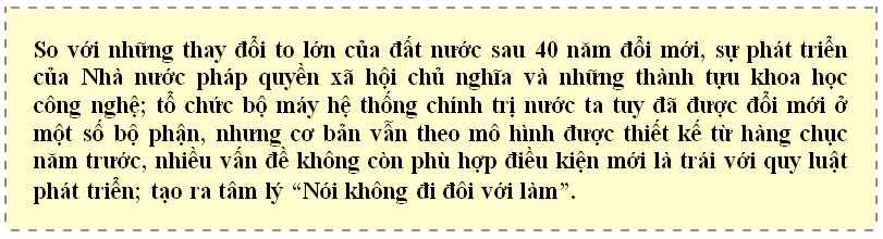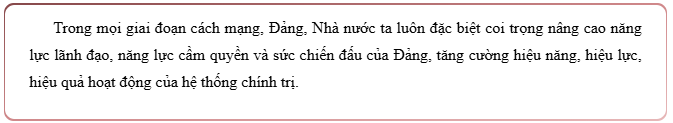 1. Trong mọi giai đoạn cách mạng, Đảng, Nhà nước ta luôn đặc biệt coi trọng nâng cao năng lực lãnh đạo, năng lực cầm quyền và sức chiến đấu của Đảng, tăng cường hiệu năng, hiệu lực, hiệu quả hoạt động của hệ thống chính trị. Đây là một trong những yếu tố then chốt đưa Đảng Cộng sản Việt Nam trở thành người cầm lái vĩ đại, người thuyền trưởng tinh anh đưa con thuyền cách mạng Việt Nam vượt mọi thác ghềnh, giành hết thắng lợi này đến thắng lợi khác. Điểm hội tụ chiến lược sau 40 năm đổi mới đất nước đang đem đến cơ hội lịch sử đưa đất nước bước vào kỷ nguyên phát triển, kỷ nguyên vươn mình của dân tộc; cũng đặt ra yêu cầu cấp bách thực hiện quyết liệt cuộc cách mạng nhằm xây dựng hệ thống chính trị thật sự tinh gọn, hoạt động hiệu lực, hiệu quả, đáp ứng yêu cầu, nhiệm vụ trong giai đoạn Cách mạng mới.