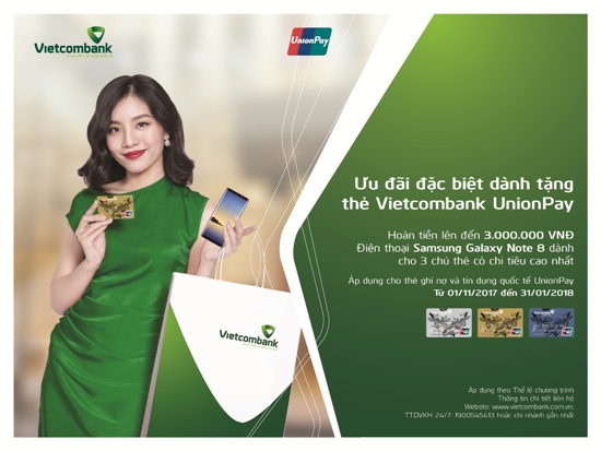 Ngoài ra, 03 chủ thẻ tín dụng/ghi nợ Vietcombank UnionPay có doanh số chi tiêu cao nhất trong thời gian khuyến mãi được tặng 01 điện thoại Samsung Galaxy Note 8 với căn cứ xét thưởng theo thời gian thực hiện giao dịch được cập nhật hệ thống của Vietcombank.