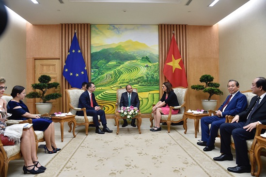 | Thủ tướng Nguyễn Xuân Phúc tiếp Bộ trưởng Bộ Môi trường kinh doanh, Thương mại và doanh nghiệp Romania, Đại diện Hội đồng EU Stefan-Radu Oprea và bà Cecilia Malmstrom, Cao uỷ Thương mại EU. |