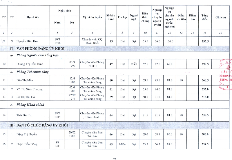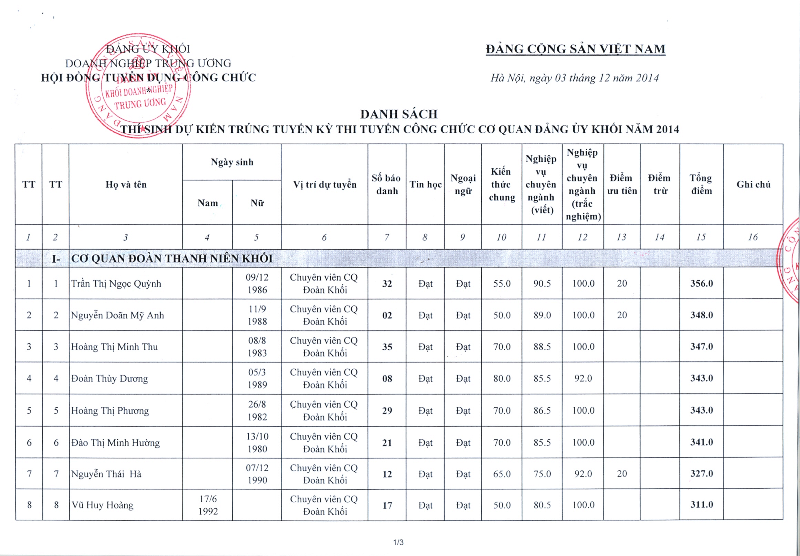 Danh sách thí sinh dự kiến trúng tuyển kỳ thi tuyển công chức Cơ quan Đảng ủy Khối Doanh nghiệp Trung ương năm 2014