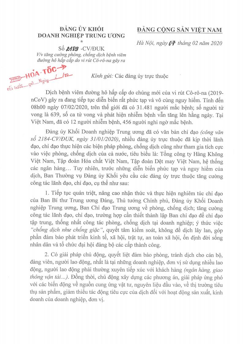 Trước những diễn biến rất phức tạp và nguy hiểm của dịch bệnh viêm đường hô hấp cấp do chủng mới của virus corona gây ra; ngày 7/2/2020, Ban Thường vụ Đảng ủy Khối tiếp tục có văn bản số 2189 - CV/ĐUK "về việc tăng cường phòng, chống dịch bệnh viêm đường hô hấp cấp do virus corona gây ra".